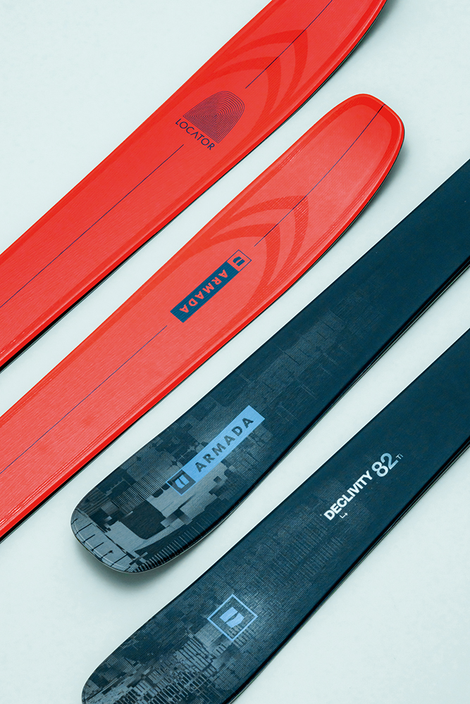 ロケーターは、アルマダが「HIKE & RIDE(ハイク&ライド)」と呼ぶツアースキーを楽しむためのモデル。アルマダが使う芯材のなかでもっとも軽いカルバコアを採用することで軽量化を実現。さらにカーボンレインフォースメントを搭載することでスキー自体の剛性をアップ。軽さを生かして遠く離れた山にアプローチできる機動性の高さと、広大な一枚バーンをハイスピードで滑り降りるような滑走性の高さを現実のものとしている。本格的にバックカントリースキーを楽しむ方はもちろん、軽量のアルペンビンディングと組み合わせて、軽いけれどしっかりターンを楽しめるゲレンデモデルとして使うのもおもしろいだろう。