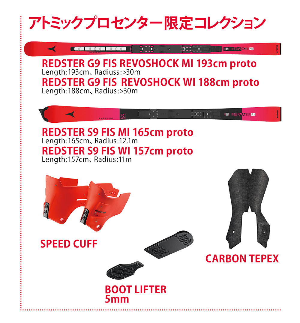 スキーはワールドカップで実際に使用されるプロトタイプ4機種。GSモデルは男子選手が使用する「レッドスター G9 FIS / レボショック MI 193cm proto」と女子選手用の「レッドスター G9 FIS / レボショック WI 188cm proto」。SLモデルは男子選手用の「レッドスター S9 FIS / MI 165cm proto」、女子選手用の「レッドスター S9 FIS / WI 157cm proto」。いずれもカタログには掲載されていない、いわゆる選手用。FISモデルのスペックをさらに高めた究極のレーシングスキーだ。