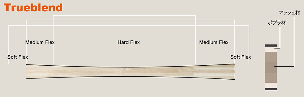 すべてのスキーに共通しているのは、カテゴリーに応じてフレックスを最適化し、特別に設計されたウッドコアでつくられていることだ。これはトゥルーブレンド・ウッドコア・テクノロジーと呼ばれ、異なる密度を持つ木材をセレクトし、それらをブレンドして配置する独自の技術。1モデル1サイズごとにソフトフレックスゾーン・ミドルフレックスゾーン・ハードフレックスゾーンと場所によって軟らかさを変えることでフレックスを最適化し、スムーズでバランスの良いフィーリングを実現するウッドコアを形成している。