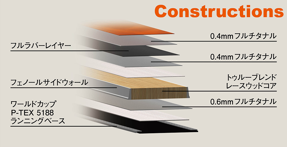 また、ウッドコアを囲む構造も、それぞれのカテゴリーに特化。レースタイプのスキーでは、3枚のチタナル(メタル)をファイバーグラスやラバーと組み合わせて芯材をサポートすることで、最適なフレックスバランスを維持しつつ、振動吸収力や安定感を向上させている。